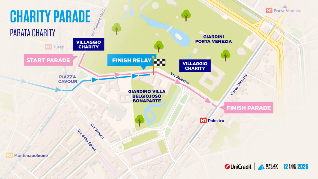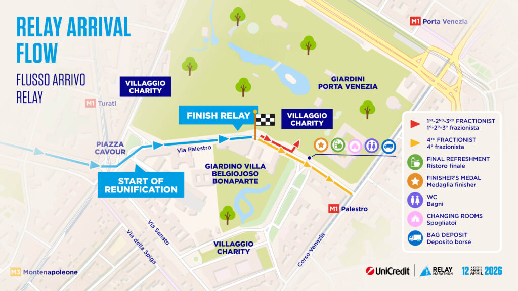 L’arrivo della 14esima edizione della UniCredit Relay Marathon sarà in Via Palestro, vicino il Charity Village posto in Via Daniele Manin e nei Giardini Indro Montanelli.