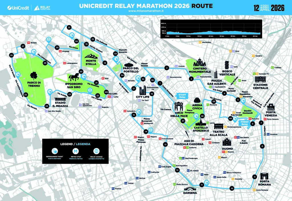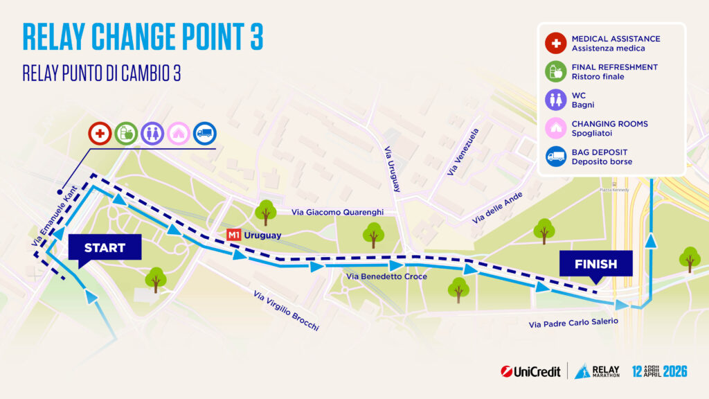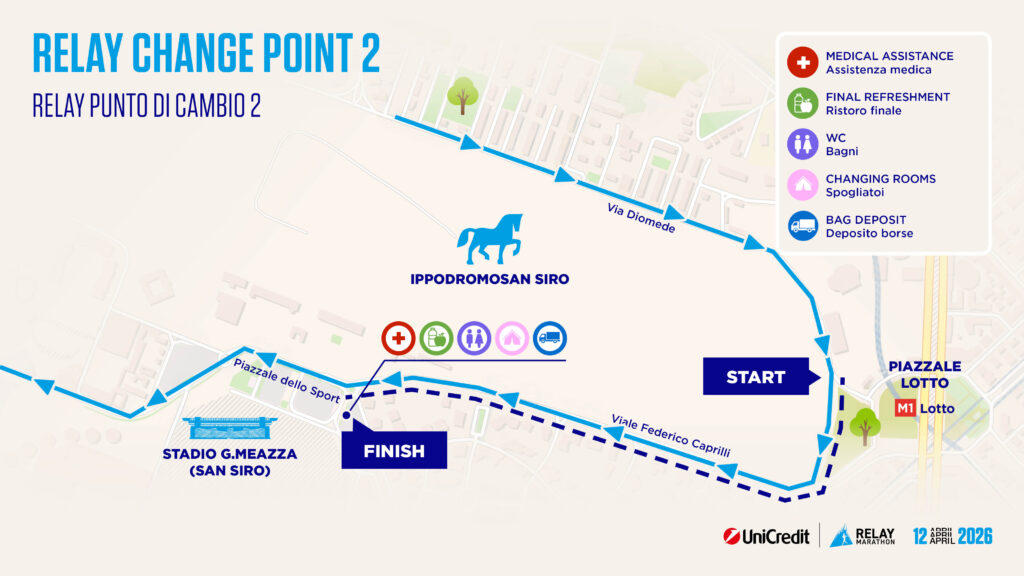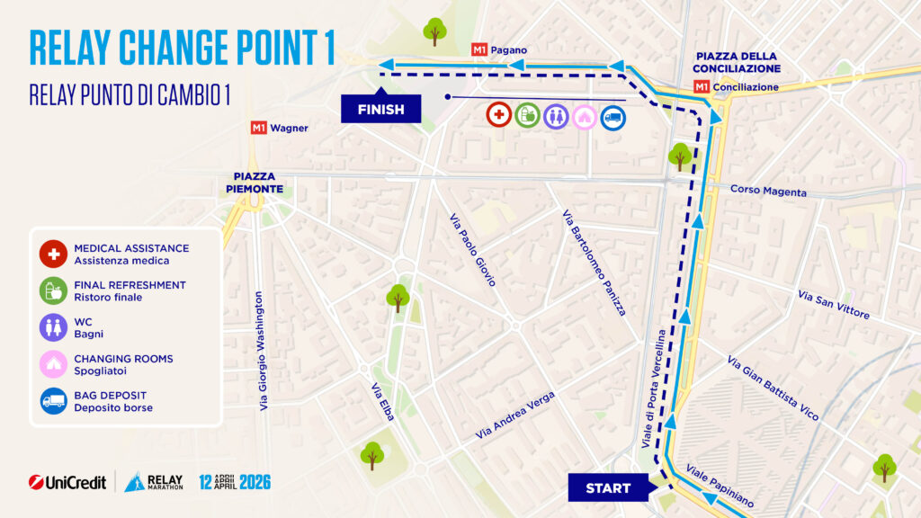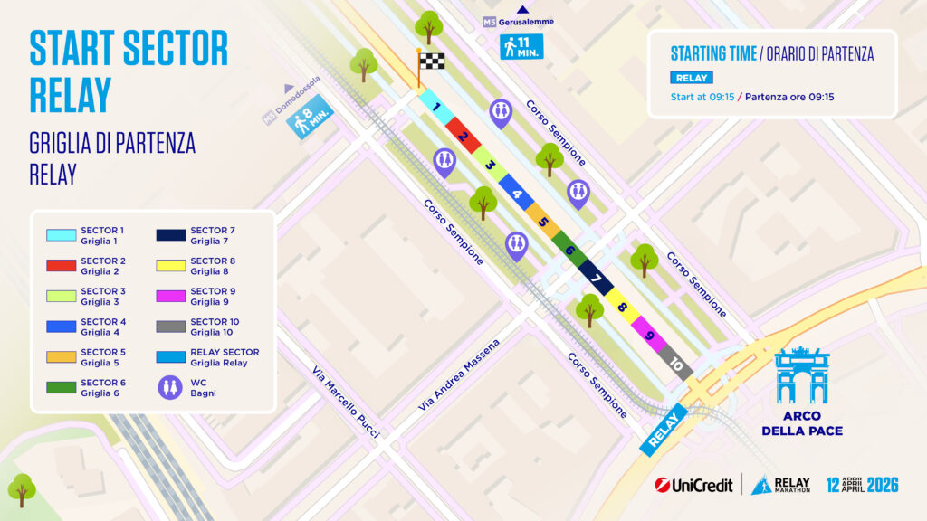 In questa pagina potete trovare tutte le informazioni utili sulla quattordicesima edizione della UniCredit Relay Marathon che si correrà Domenica 12 Aprile 2026 alle ore 9:15 con partenza da Corso Sempione.