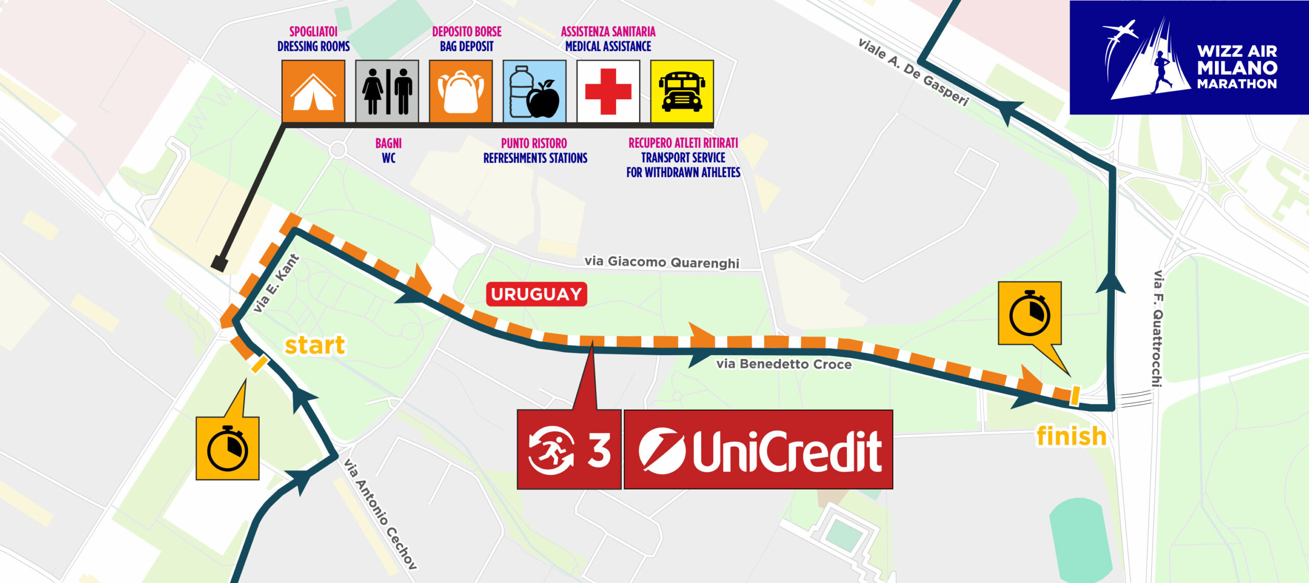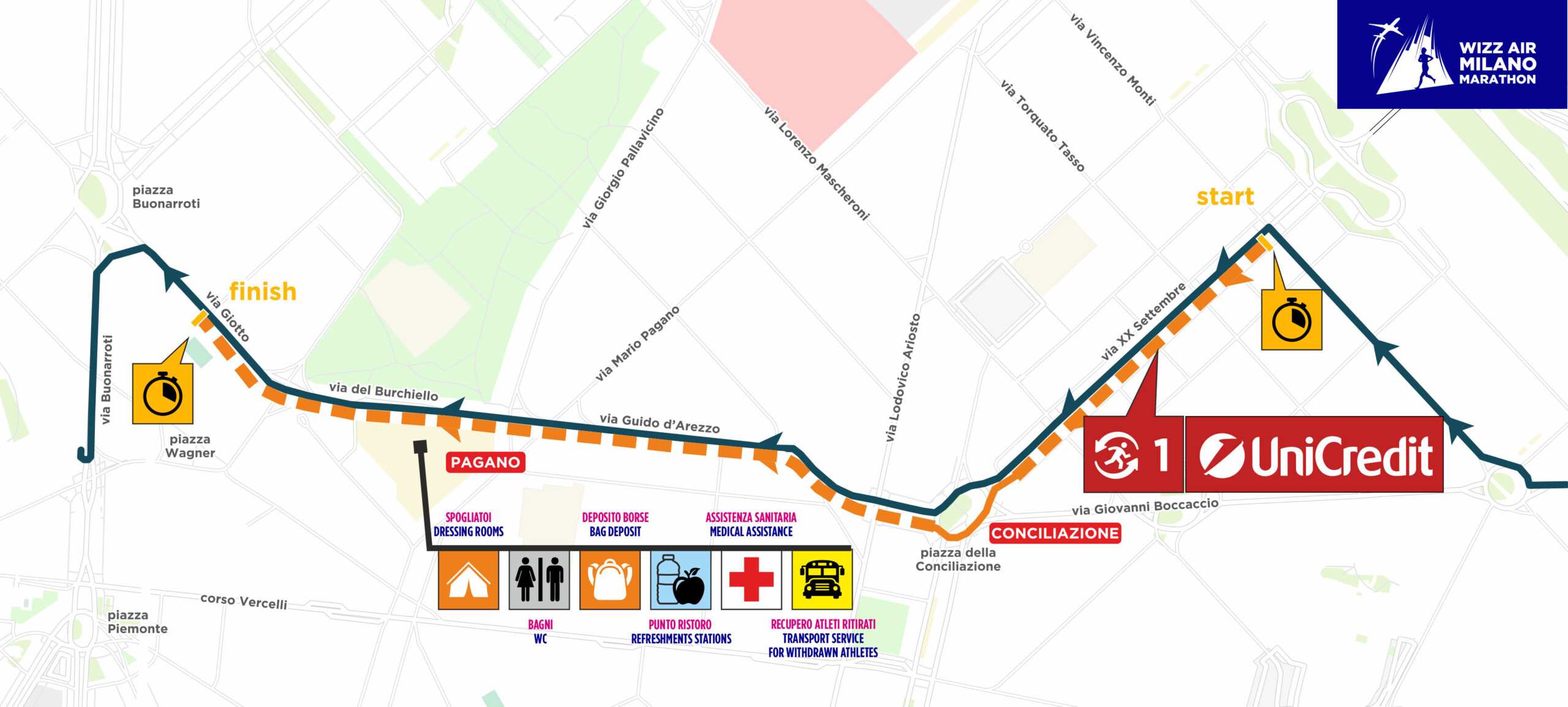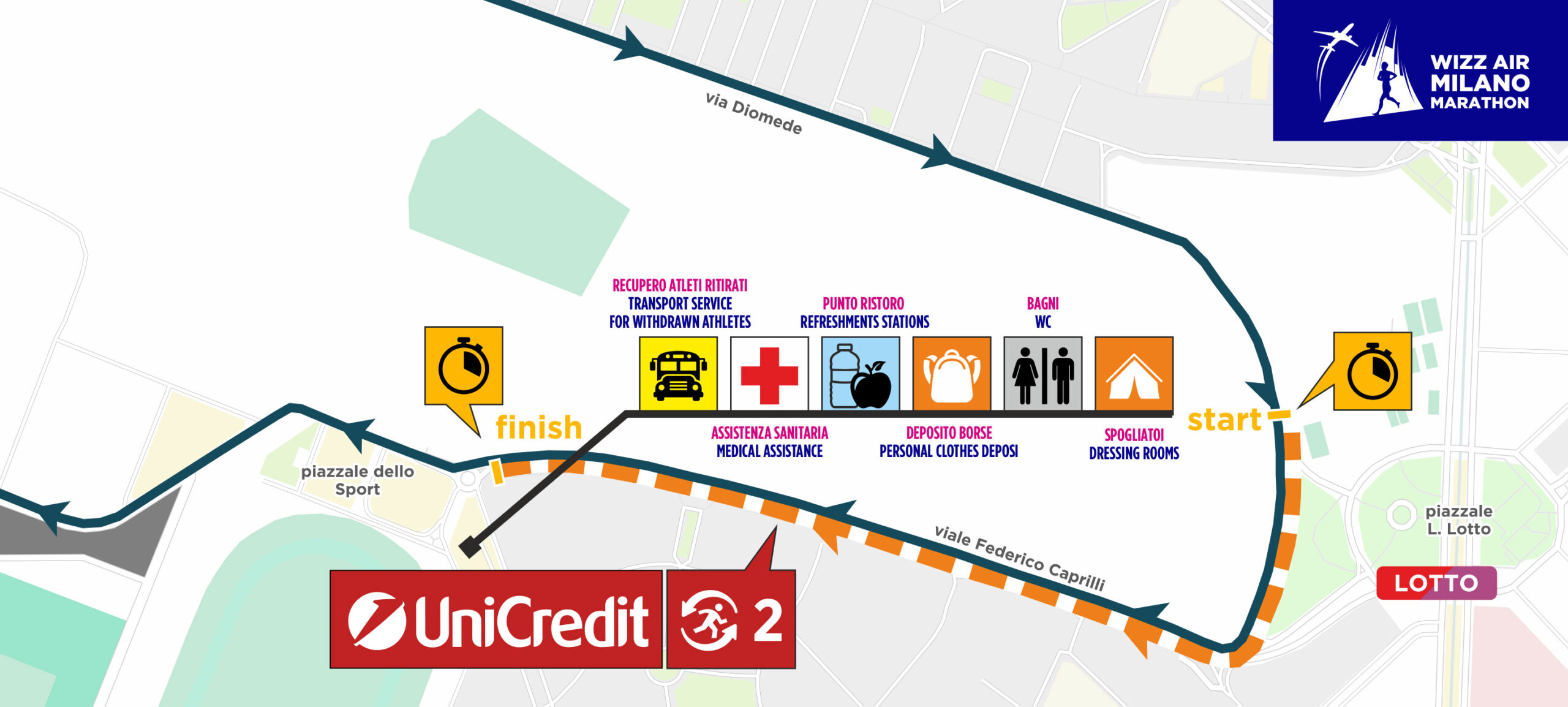 The Relay Marathon is the running format that allows the official race route to be divided into four fractions, each between 6.5 and 13 kilometers long. Now in its 13th edition, the relay has achieved great success within the Milan competition over the years, involving a huge number of people (more than 16 thousand runners registered in 2025).