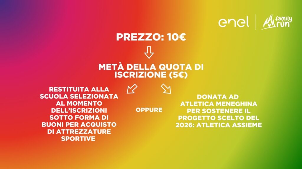 Per i gruppi composti da almeno 3 persone che desiderano correre alla Enel Family Run, è prevista una riduzione di 1€ a partecipante sul prezzo d’iscrizione.