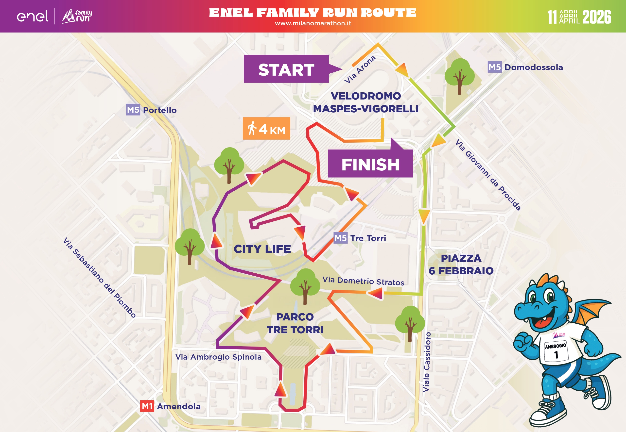 La Enel Family run vede rinnovato il suo percorso nell’edizione 2025. La corsa, che coinvolge bambini e adulti di tutte le età, si snoda lungo un percorso di 4 chilometri che si snoda prevalentemente all’interno di City Life con partenza in via Arona (di fianco al Velodromo) e arrivo all’interno del suggestivo Velodromo Maspes-Vigorelli nel Family Run Village.